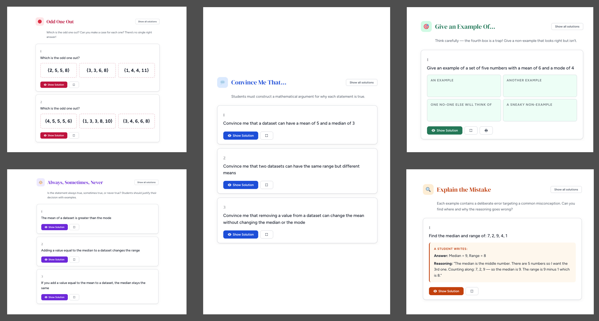 Several teachers got in touch to say they missed them, so over the weekend I started experimenting. I shared a load of the questions I had written with Claude to teach it the kind of questions I wanted and the purpose they served. I then asked Claude to suggest some other question structures that would similarly support students’ thinking and reasoning that could be applied across multiple concepts. Together, we came up with these five structures: